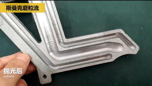 現(xiàn)在,我們用斯曼克磨粒流設(shè)備對這款鈦合金3D打印件進(jìn)行拋光,高硬度的軟性磨料在孔內(nèi)不停穿梭,經(jīng)過一定的時(shí)間后,內(nèi)壁被磨平,凸起的顆粒消失不見。