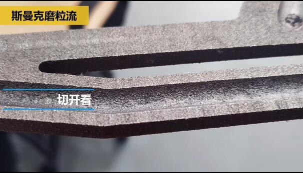 拋光前的內(nèi)孔粗糙度非常差,有很多凸起的顆粒。因?yàn)榭椎缽澢嘧儯阅阌脟娚皺C(jī)是噴不到內(nèi)腔里面的,我們把這個(gè)產(chǎn)品切開看看,可以感受得更明顯: