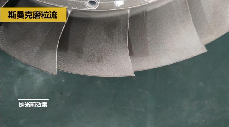 可以看到,拋光前葉片表面的顆粒感還是很明顯的,有一些特別大的凸起顆粒物。這種異常明顯的顆粒物是要不得的,會嚴(yán)重干擾氣流或水流的流動狀態(tài),使其紊亂。如果葉片表面盡量平滑,那么在轉(zhuǎn)動過程中,氣流或水流的狀態(tài)也就越穩(wěn)定。使用斯曼克流體拋光機(jī),拋光20分鐘(因?yàn)樵摦a(chǎn)品尺寸不大,如果是大尺寸葉片,拋光時間將會相應(yīng)調(diào)整)。
