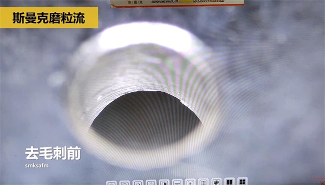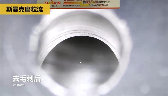 去毛刺后交叉孔位置非常平滑,沒有任何毛刺殘留,孔口也沒有任何腐蝕跡象,同時,使用流體拋光機去毛刺,可以讓孔路內(nèi)部光潔度更高,而不像人工去毛刺那樣有劃傷風險。