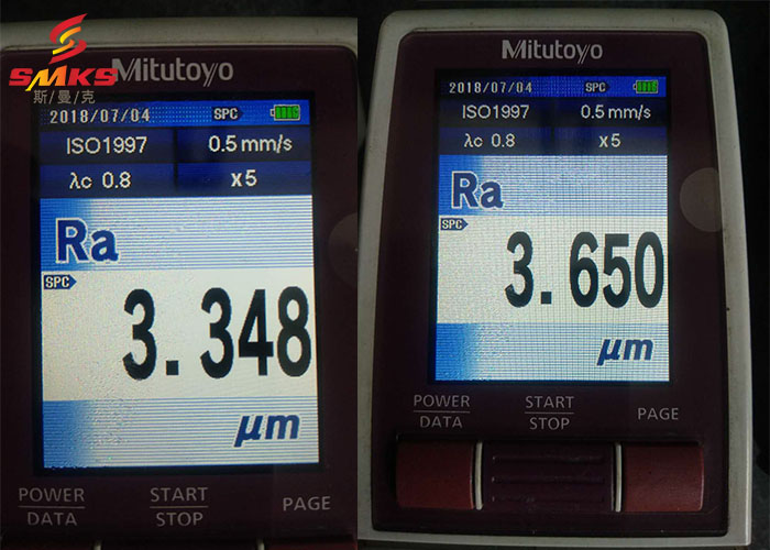 可以看到,拋光前該工件的表面粗糙度至少在Ra3.3以上。我們的工程人員選用了單向磨粒流設(shè)備為其進(jìn)行內(nèi)孔拋光,單面耗時3分鐘,共耗時6分鐘,處理完畢后的粗糙度數(shù)值如下:
