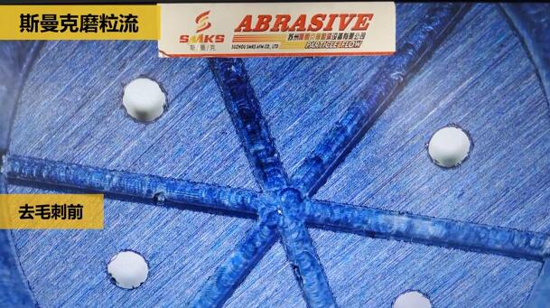 對于0.15mm以上的孔徑,斯曼克AFM磨粒流設(shè)備即可解決,配合細(xì)膩的鉆石軟磨料進(jìn)行研磨,磨料從孔內(nèi)高速噴出,將毛刺研磨成比磨粒本身還細(xì)的微粉帶走,并不影響磨料重復(fù)使用。